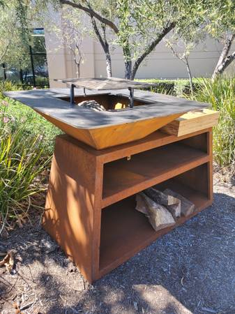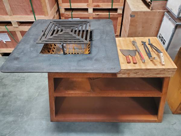 This modern design Corten Grill is a one kind grilling experience! The cooktop is made of high quality US carbon steel and the body is a high grade of US CORTEN steel or "weathering" steel. This unique modern design is sure to add charm to any backyard kitchen. Works as a grill and also as a firepit when cook top is removed. We will also include a thick commercial 4" thick cutting board free of charge with each order. Also we will include the center grill grates along with grate lift took at no charge.
