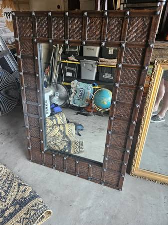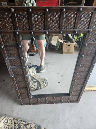 Beautiful rustic-style mirror with a solid wood frame and textured woven insets. Decorative nailhead accents add a unique, global-inspired touch. Sturdy, well-made, and ready to hang.