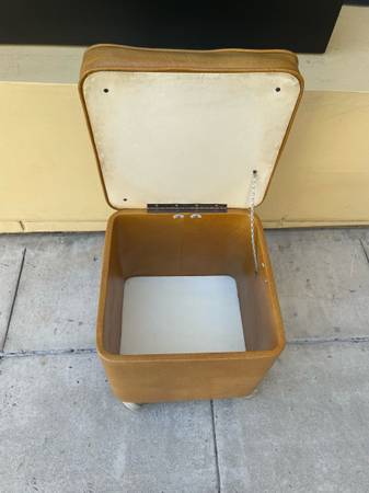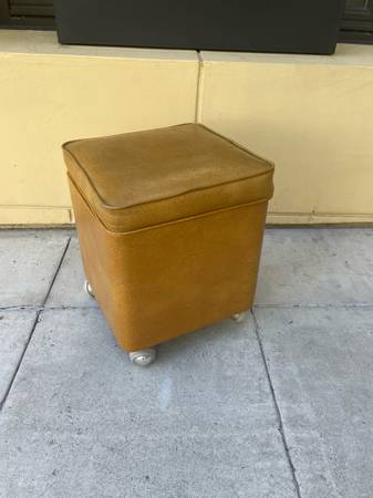 Vintage Footstool Ottoman with storage compartment. Upholstered in yellow vinyl and comes with casters. In decent to good vintage condition. Measures: 15” wide x 15”deep x 18” high.