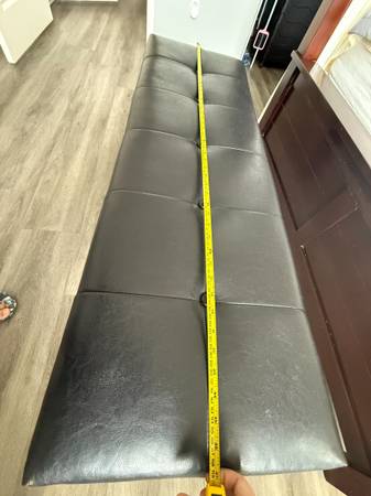 3. A dark wood bench with a black upholstered seat, ideal for sitting while putting on shoes or as extra decor and storage space at the foot of the bed.