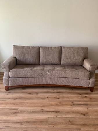 Stylish, modern sofa with unique curved seat cushion. The seat cushion is one piece so it makes for comfortable sitting and sleeping. 83" (7') long, 34" wide, 32" tall. No marks, rips, stains or odors. Excellant condition. Great price for a US made sofa, hard to find these days.