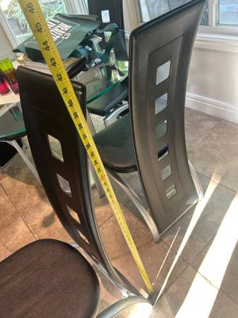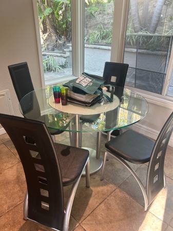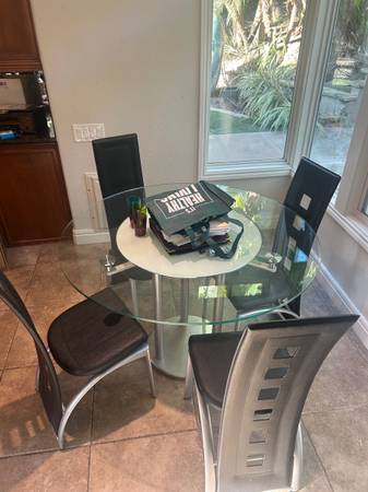 Modern round glass dining table paired with four matching black high-back chairs. The silver legs and glass top give the set a clean, contemporary look.