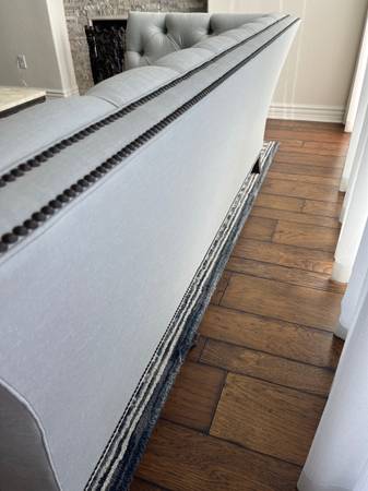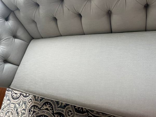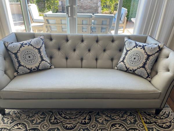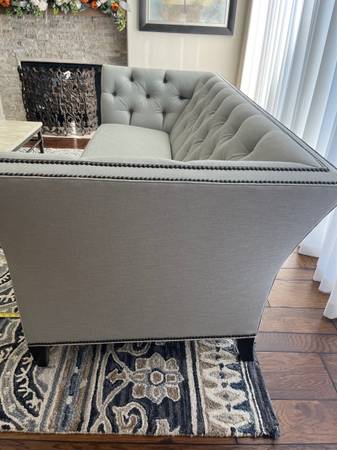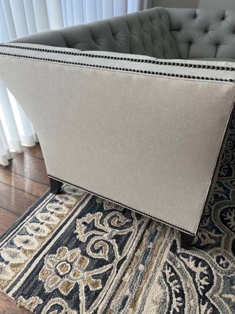 SHELTON SOFA- abel silver with Nail head copper trim. Bench seat style with tufted back and high arms. Elegant, comfortable sofa Super Clean, home with no pets or children Two print pillows included