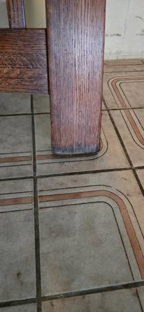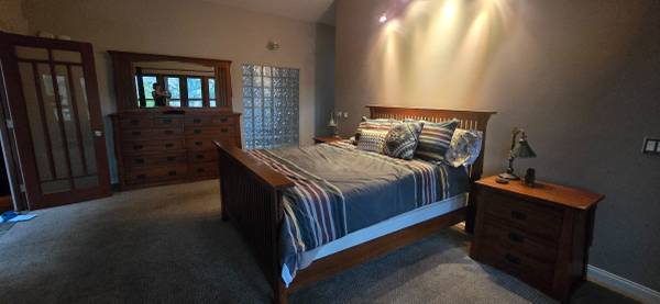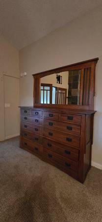 Mission style bed frame (Queen) headboard and foot board, 2 bed side stands cedar lined and a dresser cedar lined with private drawer and beautiful mirror. A few of the drawers have broken runners but easily fixable. Small water stains on bottom and side of one night stand and footboard that may be easily repaired (sanded and stained).