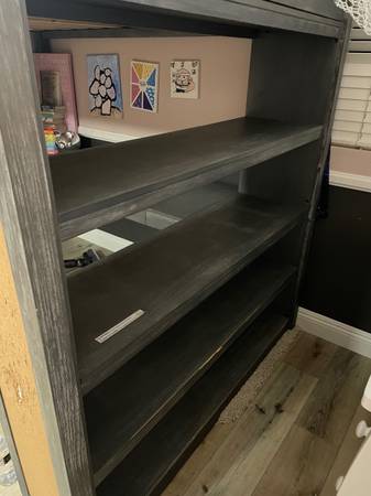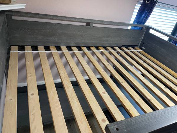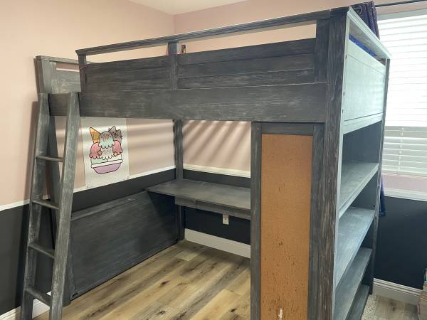Pottery Barn Loft bed with under bed desk and bookcase. Has some wear, as it is a kids bed, but in good condition. Also have the full size mattress (hybrid memory foam / spring) available. OBO