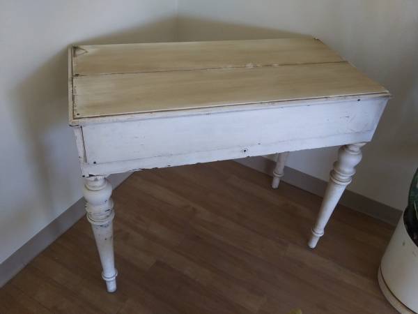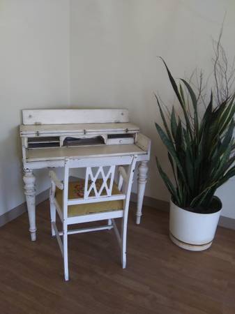 Vintage antique retro white ivory desk with compartments also works as a dining table and chair, table top folds to become a desk, furniture only for sale, purchased at an antique store.