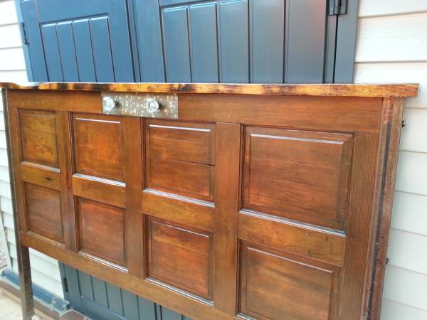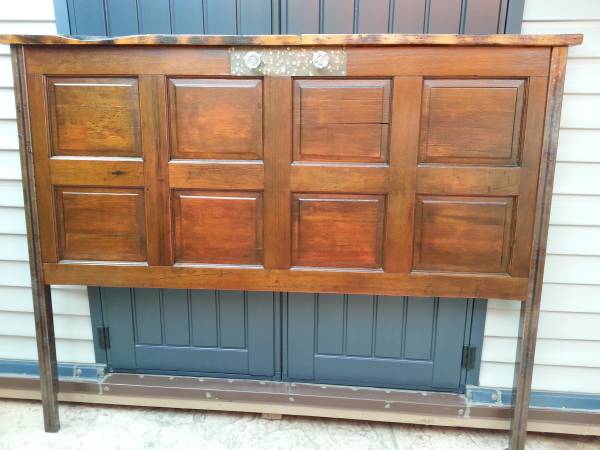 one of a kind! NEW! custom made for california king bed head board. the look= farm decor, rustic, upcycled, farm house, distressed. made from old solid wooden door and oak pallet wood, with tubular metal legs. has vintage leaded glass door handle knobs and hand pounded brass door handle plate. stands 62 in tall, 78 in wide. it is sealed with a long lasting marine varnish coat. i make custom headboards, farm tables, barn doors, etc. to the order. im located in Fallbrook. can deliver for a fee if not too far. $400 OBO call or text Jerub show contact info