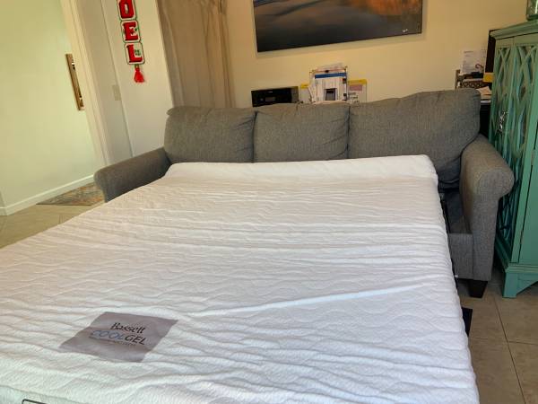 Bassett sleeper sofa, queen, with upgraded cool gel mattress. Barely used, no stains, tears, no smell. Always had full couch cover. Dimensions: W:37" H: 36" L: 84" With bed out extends to 92" cash...