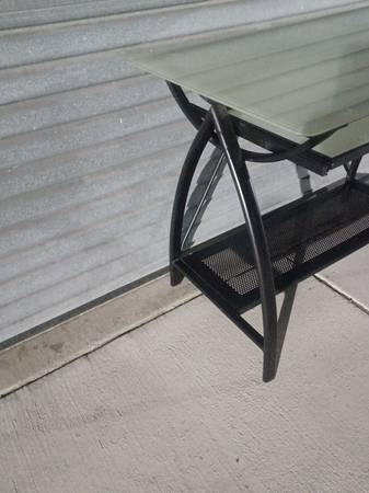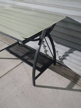 Good size desk, not too big, combination of metal base n temper glass on top with keyboard pull-out n legs resting platform on the bottom.