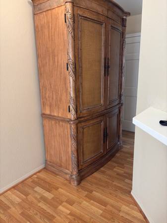 Tommy Bahama media center. Holds large television or can be used as bedroom armoire with extra shelving/drawers. Back of unit has board cut out for easy access for tv chords, etc. Paid brand new $1800 from wayfair. Excellent condition and selling at low price!!