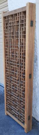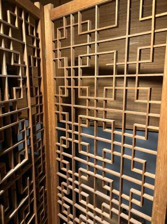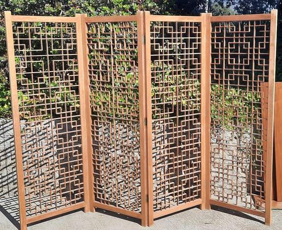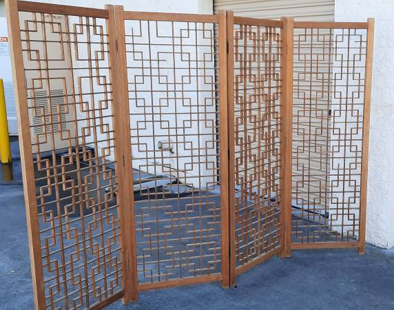 For sale is this mid century modern solid teak 4 panel room dividing partition. It measures 69.5" high, four 24" panels, (96" long straight) For transport or storage 4" thick by 24" wide. When functioning a normal self supporting zig zag it would measure up to 90" long. It has a few missing pieces but overall intact and fully functional. It is in all natural unfinished teakwood condition that could be stained, oiled, or painted depending on your preference. I will be selling for only $ 395.00 in As Is condition.