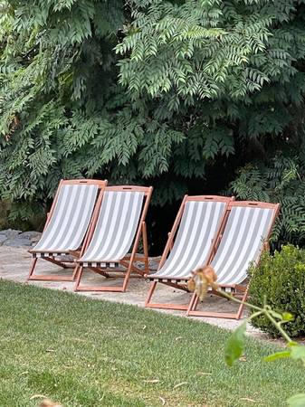 A SET OF 4 GREY WHITE STRIPED SLIG STYLE WOODEN CHAIRS WITH GREY WHITE STRIPED SLINGS. SAFAVIEH BRAND ORIGINAL COST $400. HAVE BEEN USED FOR 2 SUMMERS AND IN USED BUT GOOD CONDITION. VERY CLASSY FOR...