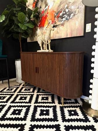 W55” D16” H30” Brand new beautiful tv stand it has 2 sliding doors and shelves on both sides. Lots of storage it has gold legs very nice.