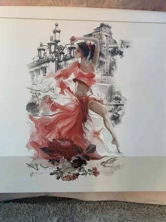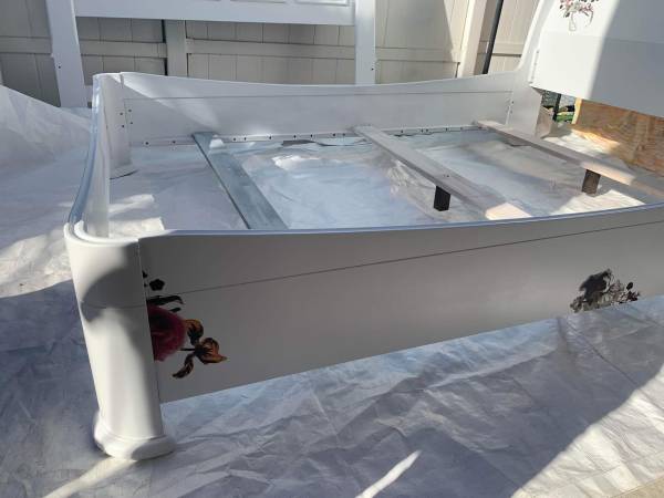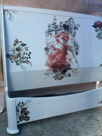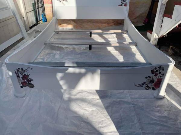 Queen bed frame looks very beautiful looks like new without scratches same style like furniture with the ballerina paint in the center ! Back of the headboard also is white color! Including two big and beautiful wooden rails and four regular wooden slants