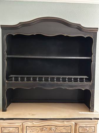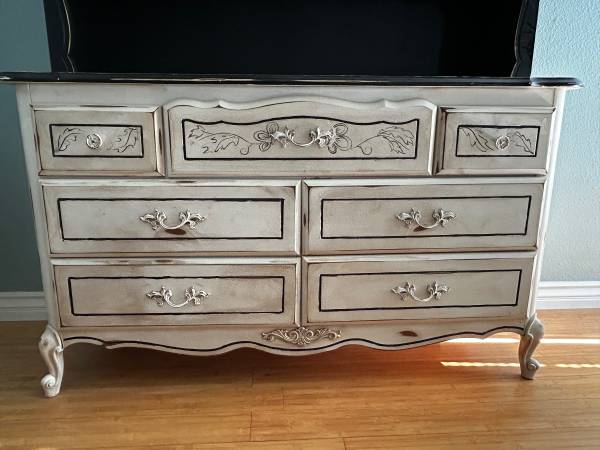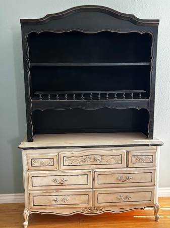Beautiful vintage cream and black shabby chic dresser with hutch. This piece was originally purchased from an antique store. It has a light in the hutch. It can be used in any room, but would look really cute in a girl’s bedroom or baby room.