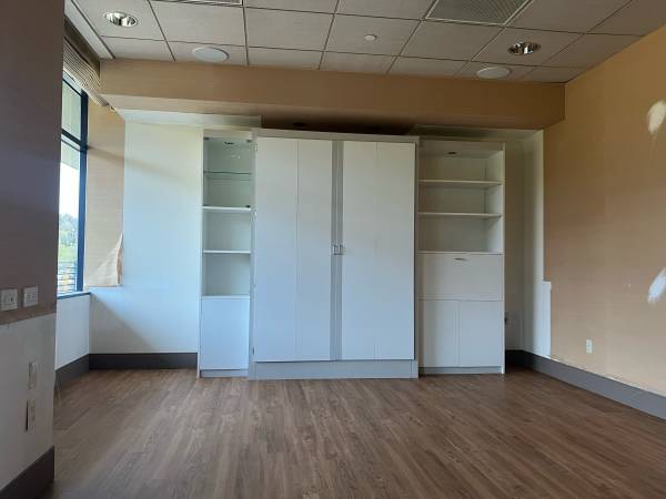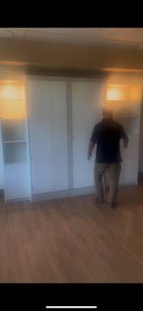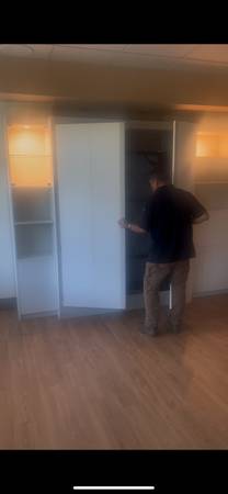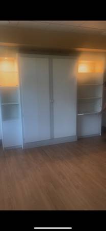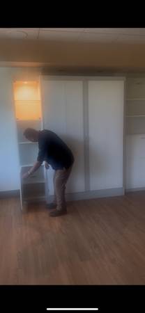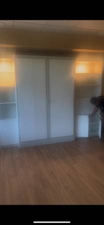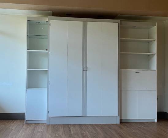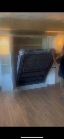 This is a large hidabed wall bed with lots of storage, lights and glass shelves. was never actually used. Beds new but did get a small rip when moving it. this is heavy and needs bolted to floor for spring part of bed to rise and lower. 90" tall x 116 wide cost over $2k new. its disassembled, will need a truck, will not fit in suv.