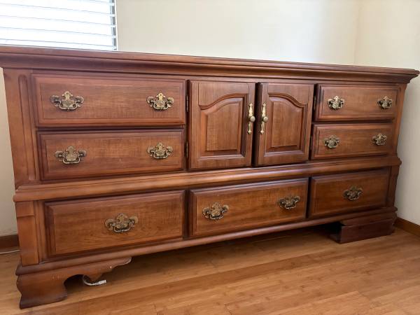 Solid wood bedroom set with headboard, two side tables, and a dresser with a separate mirror that can be mounted to the dresser. Unique bronze eagle accents on the handles (Mattress not included). Some wear and tear on the left side of the headboard. All of the drawers work well. If we were not moving, I would sand it down and change the color. Good foundation for starting something fresh or can be used as is. $225 obo