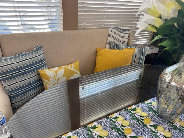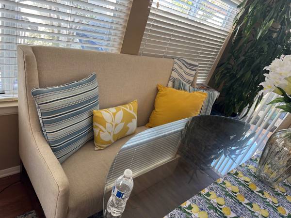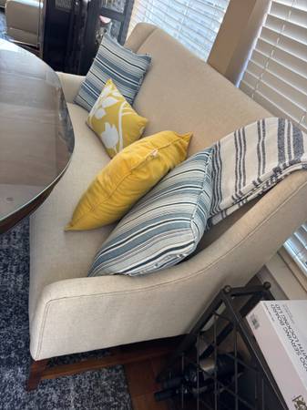 Beautiful like new bench . Fits up to 3-4 people. You can use it in living room or dining table instead of chairs for mix and match look. The color is cream .