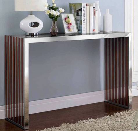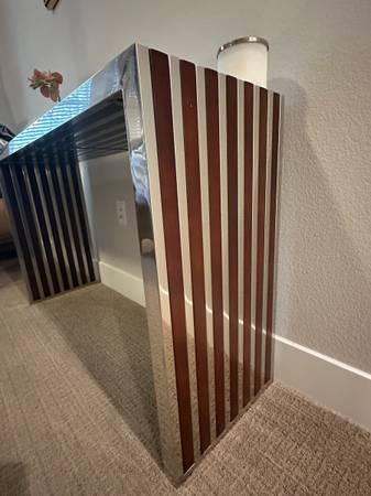 Chrome metal with faux walnut wood inlay mid-century modern style console entryway table for sale. Heavy and sturdy piece. Great overall condition from a smoke-free home. $150/obo. Cash and pick-up only. Txt me @ Seven six zero 331 Nine one 77 with any interest. Thnx for looking!