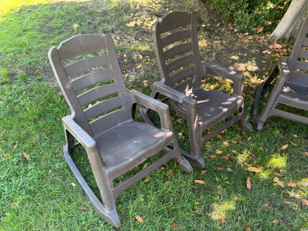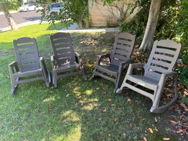 4x Patio Outside Stacking Resin Frame Rocking Chair Seat. They’re all in good used condition, one is a bit discolored from sun wear. No cracks in the material and are sturdy. They do all stack into eachother for transportation and storage. Pick up in Escondido San Pasqual 92027 area.