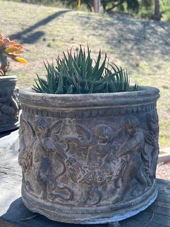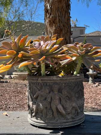 PERFECT FOR YOUR BACKYARD GARDEN ~*~ HEAVY SOLID CONCRETE CHIMINEA , MADE IN MEXICO. ALSO HAVE 2 MATCHING POTS. ASKING $250 FOR THE SET OF THREE ALSO HAVE A SWEET CONCRETE GRIL HOLDING FLOWERS...