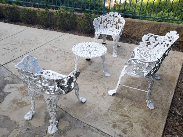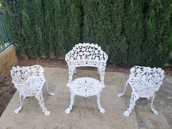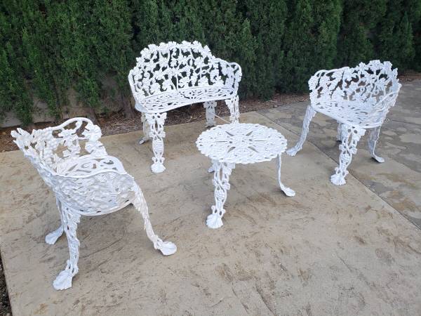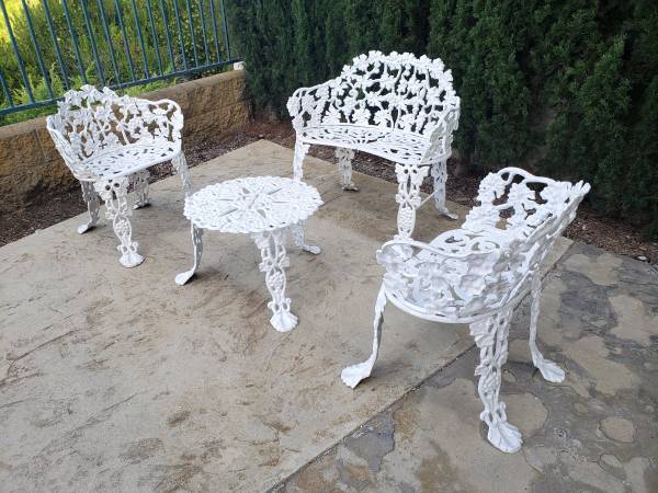 This is a complete 4-piece set made of durable cast metal, featuring an intricate floral/vine design. The set has a lovely, chippy white finish for that authentic shabby chic or French country look. It's incredibly sturdy and has a wonderful patina that only comes with age.