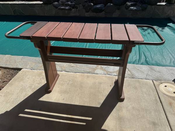 Redwood table for rectangular Hot Tub to set food, drinks, etc. or hang towels or for other use in yard. Recently stained. Handle to handle length is 58". Handles can be removed. Table surface is...