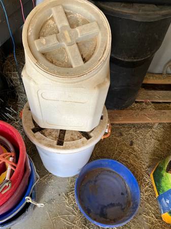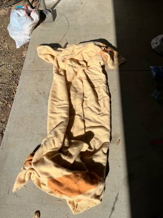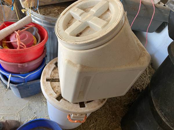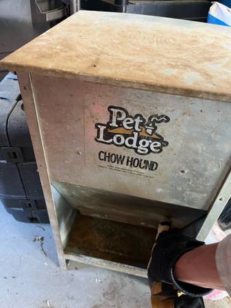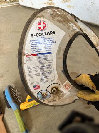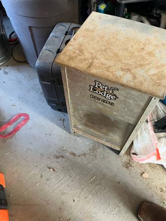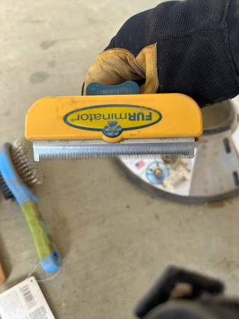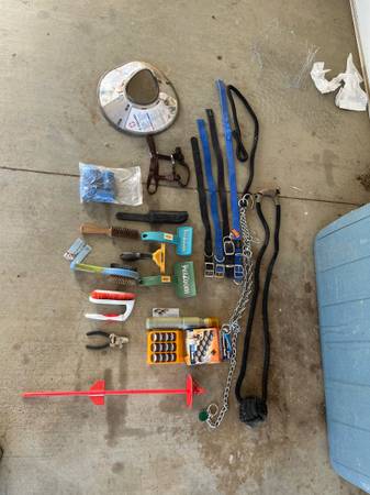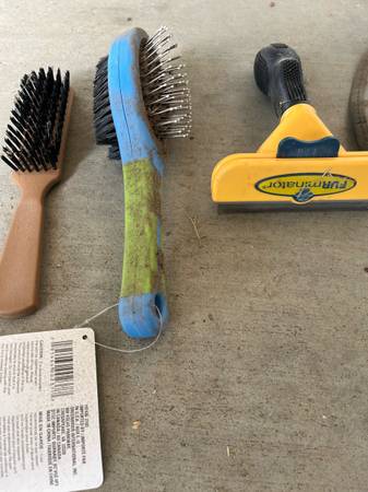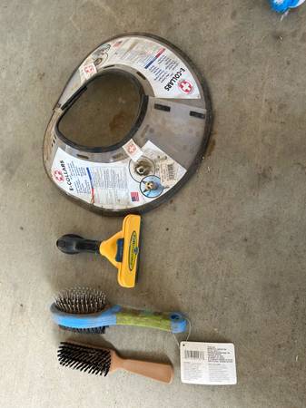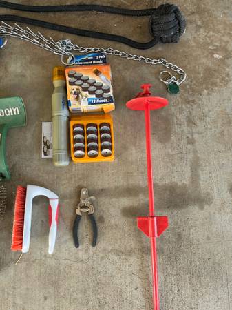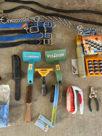 Have some large food storage containers, a metal dog feeder, water bowl , some large collars, nail filer with unused refills, metal nail clipper, a big wool blanket (not used by any pet), a tie down stake, a pooper scooper, grooming stuff and deshedder.