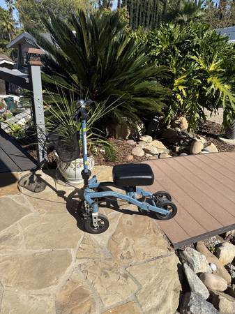 Swivelmate Knee Walker by TKWC INC, Steerable 90 Degree Turning Radius, Premium Quality, Extra Thick Knee Pad, 5-Wheel Stable Design - Knee Scooter Crutch Alternative. Barely used. In great condition. The Swivelmate's unique patent pending BeltDrive steering outperforms every other knee walker on the market today by offering a 90 degree turning radius. The user still has full control of steering while utilizing the 90 degree turning ability, so stability is never compromised. This model was designed specifically to be strong and stable, yet provide the user unparalleled maneuvering ability.