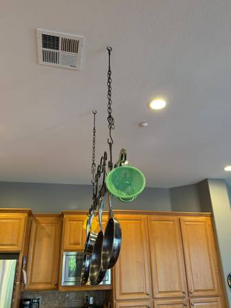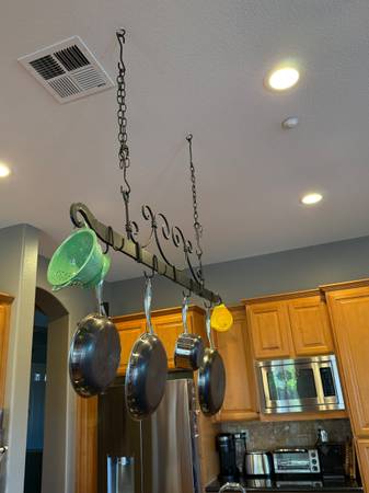 Wrought Iron Pot & Pan Rack. 53-1/4" long, 10-3/4" high, made of 2" x 3/8" bar stock with decorative swirls, with hooks for 8 pans plus end hooks for 2 more. Plenty of chain for a 12' ceiling or higher, with 2 long threaded hooks to attach to your ceiling. Great condition, ready to enhance your kitchen.