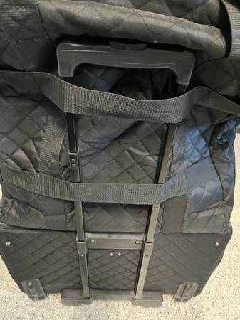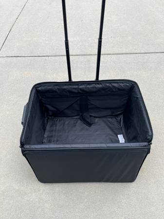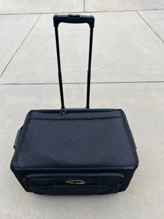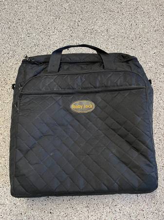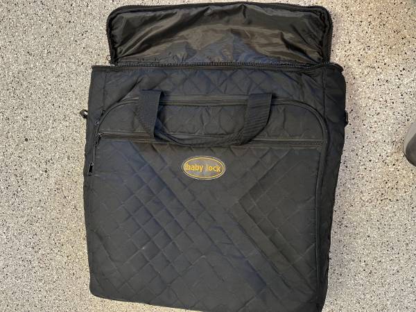 Gently used Babylock sewing trolley for Destiny (or similar sized) embroidery machine. Separate carrier for sewing machine and embroidery platform. Nylon exterior with pockets for accessories and incidental items. Interior dimension of sewing machine carrier is