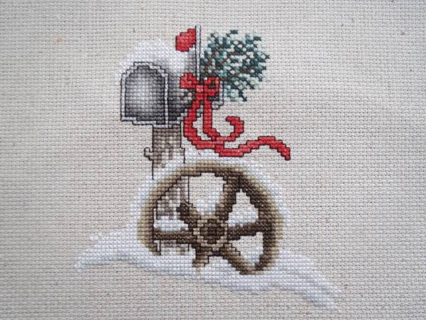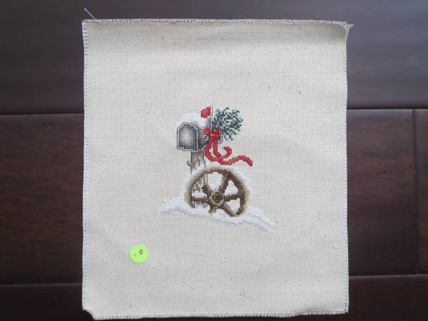 For sale is this completed cross stitch artwork. I hired someone to make this for me. She was known for her nice, even stitches. The picture features a wooden wagon wheel sitting in the snow, leaning against a mailbox. The mailbox is decorated for Christmas with a ribbon and greenery. The artwork could be made into a pillow or framed, truly a unique, one of a kind decoration. The picture area measures 5 3/8 x 5 inches. The fabric area is 10 3/4 x 12 inches. Just $10 cash, please. Thanks for looking!