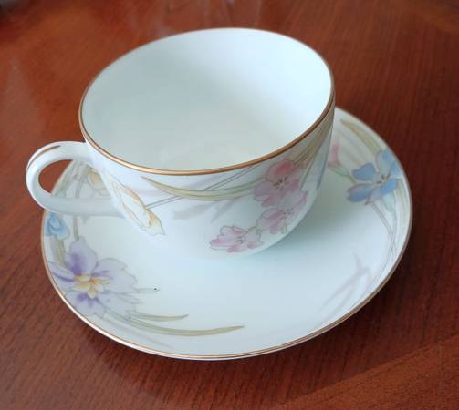45 pieces. Missing 1 cup. 24Kt Gold trim on edges of pieces.