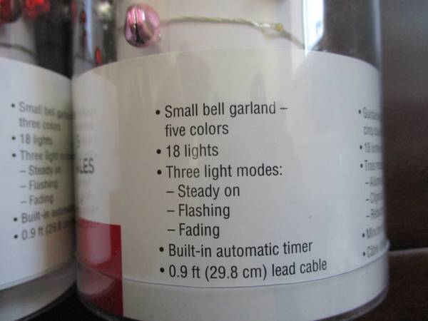 For sale are two new packages of LED dewdrop lights with colored bells. The lights are on a built in timer with 3 light modes: steady on, flashing and fading. There's 18 lights on the strand that's 6 feet long. Requires 3 AA batteries. Just $5 per package, cash only, please. Thanks.