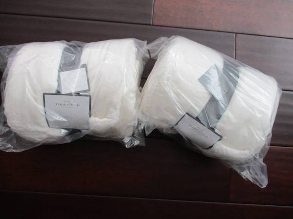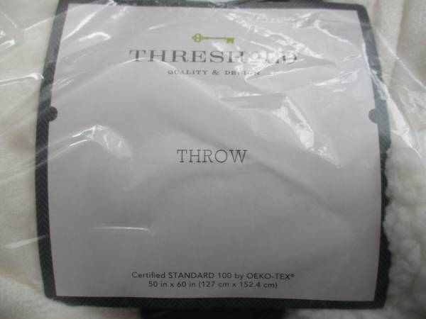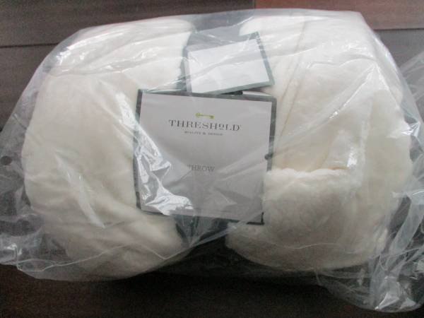 For sale are two new in package Threshold Ivory throws. The throws measure 50 x 60 inches and are machine wash and dry. They're a smooth texture on one side and a fluffy thick fleece on the back side. Just $10 each, cash only, please. Thanks for looking.