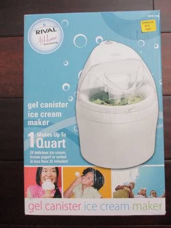 For sale is this Rival gel canister ice cream maker that I never got around to using. The packaging says it makes up to one quart of ice cream, frozen yogurt or sorbet in less than 25 minutes, all without using ice or rock salt according to the box. There's recipes on the side of the box to get you started. Just $15, cash only please. Thanks!