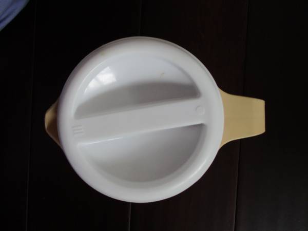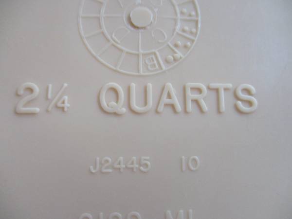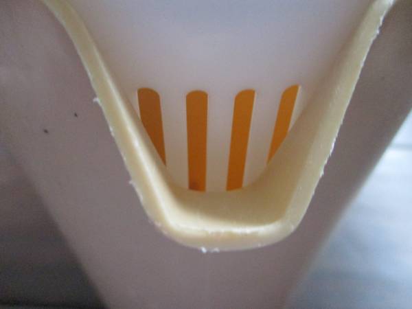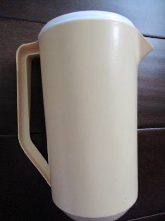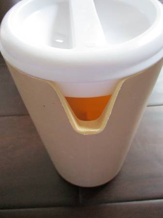For sale is this vintage Rubbermaid beverage pitcher with lid. The capacity for the pitcher is 2 1/4 quarts. The lid turns to three positions: fully closed, fully open, and with a grid that prevents ice from coming out. My mother used this for orange juice and for parties where she made Kool-Aid with ice cubes. Just $7 cash, please. Thanks.