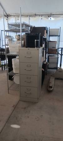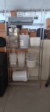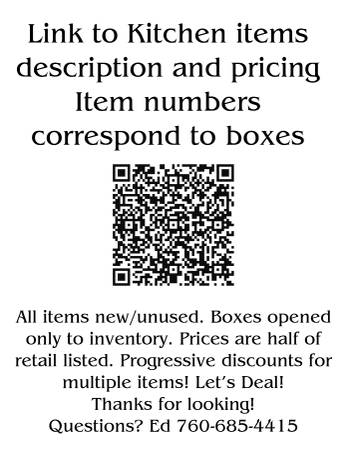 For Sale! HUGE assortment of Commercial Bakery/Restaurant Equipment- Stainless tables, Rolling Shelving, Chairs, Folding tables, Furniture, File Cabinets, Appliances, Cooking pans, Gas Grilles, Latex Gloves, Food Product Containers, Industrial Fans, etc. Also approx. 75 consumer grade kitchen items in boxes- all new, never used. Pots, Pans, Skillets, Mixers, Fryers, Pressure Cookers, Ice Cream Makers, Blenders, etc. There will be specific upcoming onsite sales days TBD but arranged showings can be scheduled. HUGE TENT FULL OF ITEMS! Located in South Escondido. Commercial items should be viewed and are priced individually- SEE SAMPLE PHOTOS. Consumer items can be viewed via spreadsheet at link below- all of these items are 50% off listed 'new' prices. Discounts for bulk purchases!