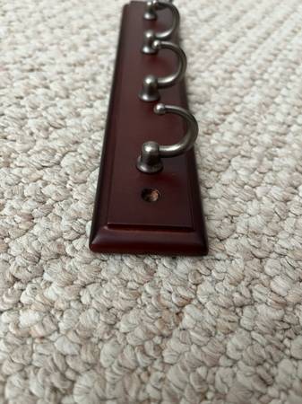 Dark cherry brown wooden key hook holder organizer for wall. 4 satin brushed nickel hooks. 8 3/4” x 1 3/4” very good condition. $10 northeast Escondido