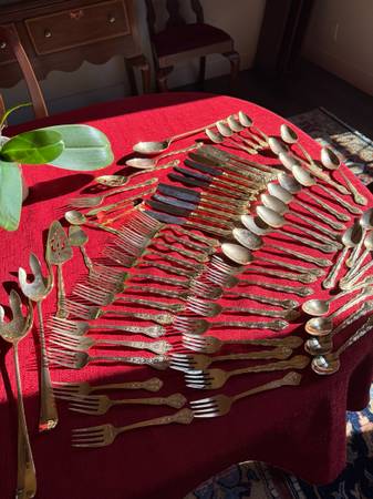 Gold-toned flatware and serveware embossed with an elaborate rose design. Coordinates beautifully with Old Country Roses and other floral-patterned china.