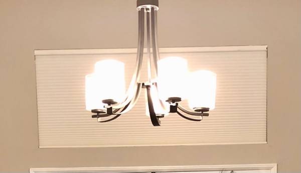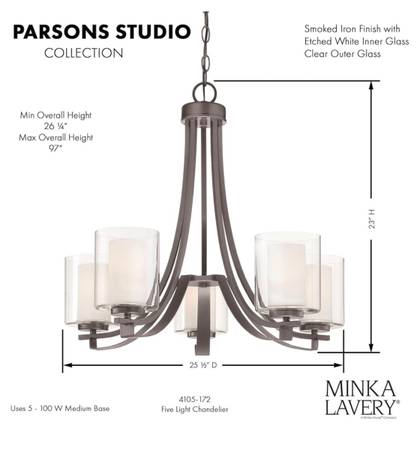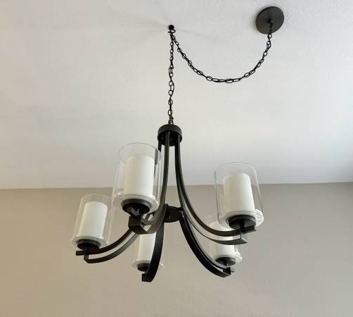 Minka Lavery Chandelier. 5 glass shades with white etched glass drums. Alloy steel with smoked iron finish. Online and Amazon price is $339. Like new and works fine, just wanted a different style.
