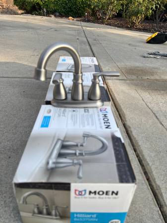 Selling three brand-new Moen Hilliard 4-inch centerset bathroom faucets in brushed nickel finish. Each faucet is still in the original box, never installed. Sleek and modern design with a high-arc spout and two-handle operation. Great for updating multiple bathrooms at once.