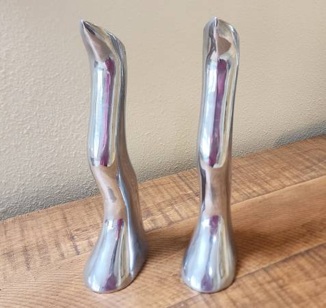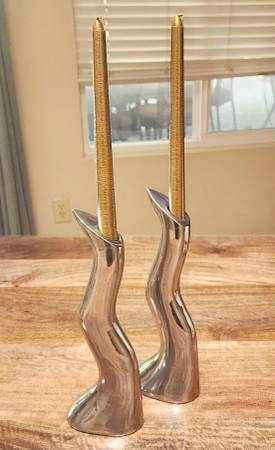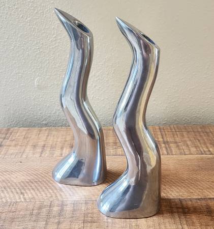 Set of 2, Scandinavian Modernist, MCM, sculptural abstract, heavy (2.15 lb each) solid aluminum candle stick holders by Swedish artist, Anna Efverlund. Dramatic addition to any table or Mid Century modern decor. Excellent pre-owned condition, deep silver tone. Set of gold candle sticks included. IF THIS AD is UP, they are still AVAILABLE.