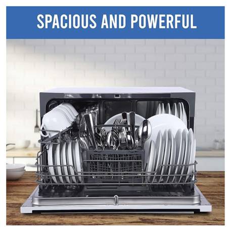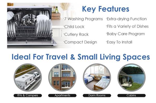 • COMPACT AND PORTABLE: This mini tabletop dishwasher is great for small kitchens, apartments, RVs, and boats with available hookups. The space inside the dishwasher is big enough to fit 10-inch diameter dishes.