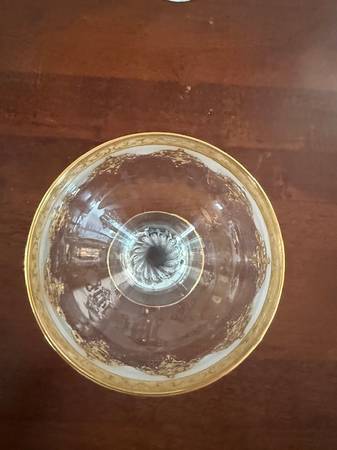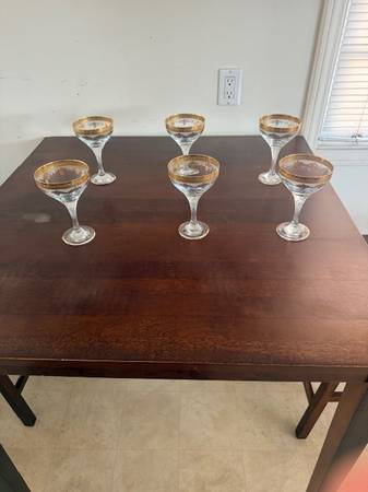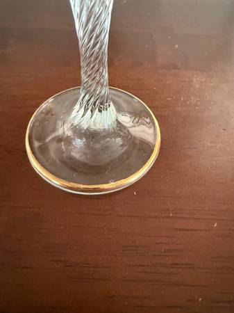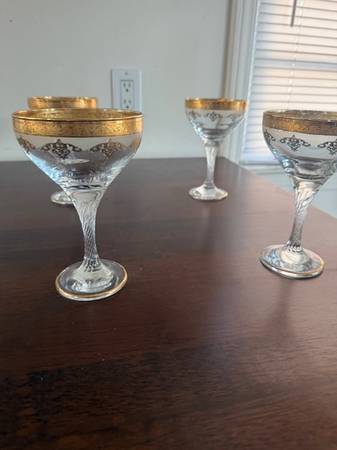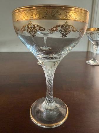 A set of 6 Gold leaf champagne glasses with etching. Very nice condition. I don't know where they are made. I didn't see a sticker on any of them. Thanks for looking.