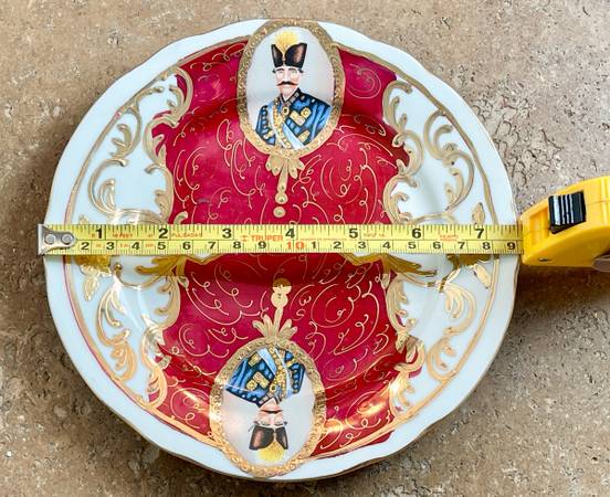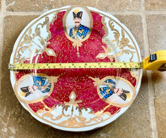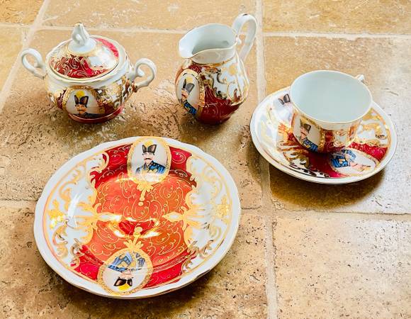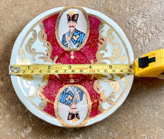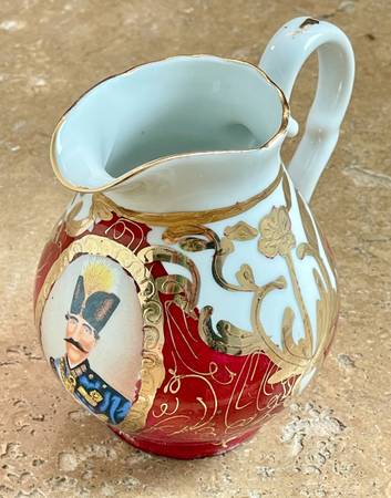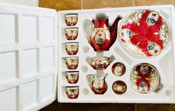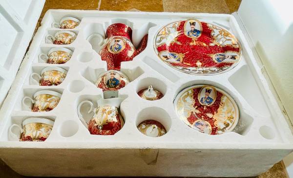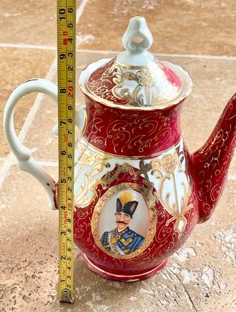 For sale is a brand new (in the box and never-used) rare vintage Nasser Al Din Shah china Qajar teas set including one tall tea pot with lid, one creamer, one sugar bowl with lid, six tea cups, six saucers, six small plates, one medium plate, all individually placed in a custom made box to protect and store the antique tea set.