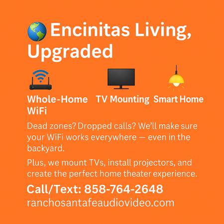 We specialize in TV installation, home theater design, and WiFi optimization for luxury homes in Rancho Santa Fe and the surrounding North County area. Whether you need to mount a TV, relocate your audio/video system, or extend high-speed WiFi throughout your property, we deliver flawless results.