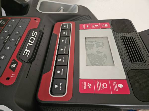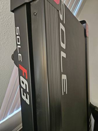 The SOLE F63 features a 3.0 HP motor, speeds from \(0.5-12\) mph, and 15 levels of incline. It includes a 6.5-inch backlit LCD display, 10 onboard workout programs, a 20" x 60" running surface, and a Cushion Flex Whisper Deck designed to reduce joint impact. Connectivity options include Bluetooth speakers and a USB port for charging, along with a tablet holder and accessory storage