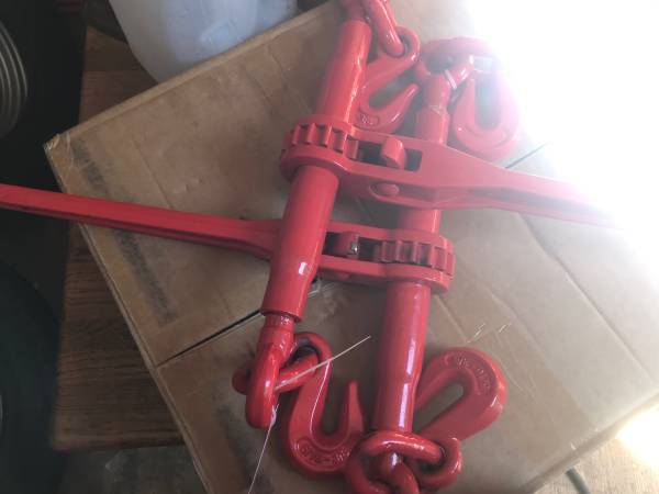 NEW never used. Xtra not used. 2 ratchet chain binders for 5/16 and 3/8 chain. Rated 5400 lbs working load still available. emails only. no text. no phone. cash only.