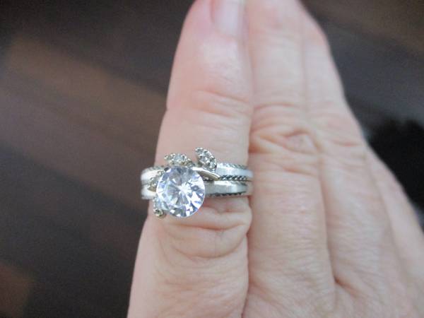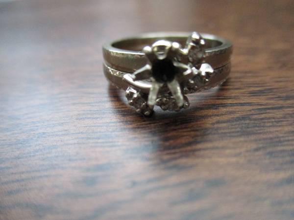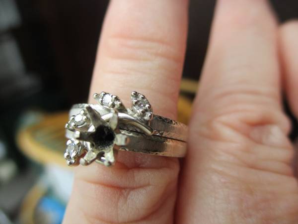 For sale is this gorgeous Kaynar 14k white gold wedding band and engagement ring set that I got in the 1970s. The ring originally had a one-half carat diamond in the engagement band. The mounting is still there to add a diamond. The center stone mount is surrounded by four leaves in a half circle shape. Each leaf has a small diamond in it. I've included a photo with a faux diamond in the mounting to give you an idea of what the ring would look like with a center stone. Just $299, cash only, please. Thanks for looking